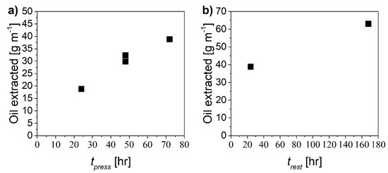 Amount of oil extracted as a function of (a) pressurization time at constant trest equal to 24 h and (b) rest time at constant tpress equal to 72 h.