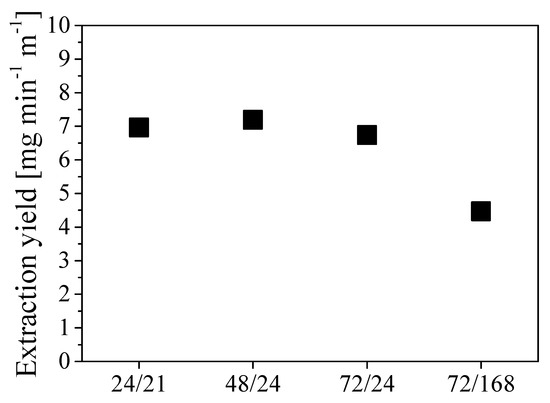 where moil is the mass of oil extracted and L is the tube length. The values of extraction yields estimated in the different cases are shown in Figure 8 as a function of different combinations of pressurization and rest times expressed in hours.