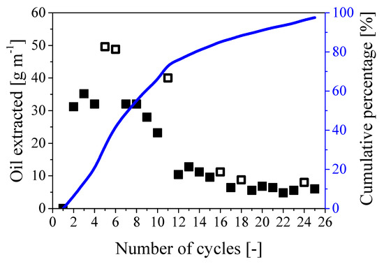 Amount of oil extracted during 25 repeated cycles. Symbols: mass of oil extracted per cycle; full symbols: 24/24; empty symbols: 24/48. Curve: cumulative percentage of extracted oil referred to the expected overall oil mass of 550 g m−1.