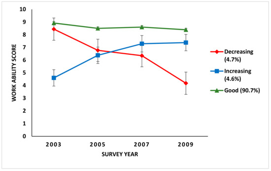 This study aimed to examine the pathways (trajectories) of work ability over 6 years of follow-up. The second aim is to explore whether the baseline psychosocial or physical working conditions and multisite musculoskeletal pain influence work ability pathways.