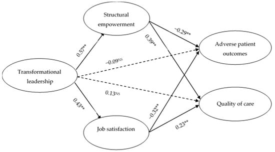 Prior research shows that a terrifyingly high ratio of adverse incidents in healthcare institutions is because of preventable circumstances, some of which are due to nurse-related aspects [7]. For example, in a study conducted in five countries, Aiken, et al. [8] concluded that poor working conditions for nurses and inadequate staffing were predictors of adverse patient outcomes. Scholars have associated these outcomes with the low quality of the nursing job atmosphere and the absence of appropriate leadership styles [7,9]. Previous studies found that deficiencies in hospital care quality are common in all countries [10,11] and an improvement in the work environment is a low-cost strategy to improve safety and quality in hospital care and to increase patient satisfaction [12]. In the institutional context, transformational leadership (TL) is known as a relational leadership that helps healthcare organizations to overcome APOs [13]. However, only a few types of research has explored the ways that leadership effects the behavior of the employees and successive implications about the safety consequences of the patients [14,15]. For example, Houser [16] found that transformational leadership practices were positively related to staff expertise and negatively related to staff turnover, both of which contributed to reduced adverse patient outcomes including patient mortality, hospital acquired infections, medication errors and patient falls. Capuano, et al. [17] added to these findings by showing that transformational leadership practices were also associated with staff expertise, which in turn decreased the same adverse patient outcomes. The findings of Paquet, et al. [18] also revealed the indirect effect of leadership on patient outcomes (decreased medication errors and patient length of stay) through reduced absenteeism. On the other hand, Lavoie-Tremblay, et al. [19] indicated that transformational leadership practices potentially lead to high quality of care and weak intention to quit the healthcare facilities. In the perspective of these studies, the main focus was to determine the ways that TL related to factors that affect the quality of healthcare and the safety of patient outcomes. Hence, the aim of this research is to develop a research model that links transformational leadership (TL) to structural empowerment (SE) and job satisfaction (JS) and then to the occurrence of APOs and the patient’s quality of care (QOC). In this research, the researchers assessed how TL impacts the patients’ desired QOC and APO through mediators, SE and JS.