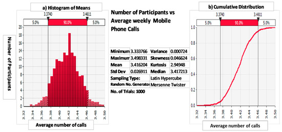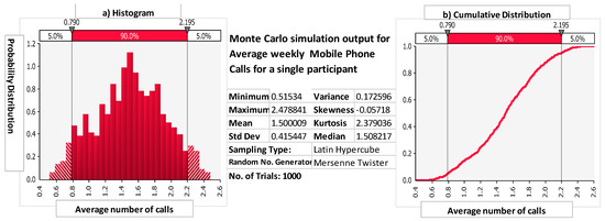 (a) Monte Carlo simulation for the average number of mobile phone calls after 1000 trials for an individual participant. Depicted is the histogram, plotting the probability distribution (y-axis) vs. average weekly mobile phone calls (x-axis) after n = 1000 trials, and (b) cumulative distribution showing risk probability vs. average weekly mobile calls.