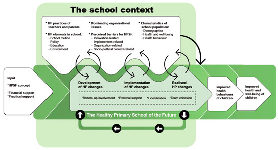 School context is defined as the specific circumstances and characteristics of each school, which relates to the social, political, economic, and physical environment; the characteristics, behaviors, wishes, and needs of the people in the school; the wider community in which the school is located; as well as the history and organization of the school [27,28]. This definition shows that a school context consists of many different aspects. Previous studies have shown that some specific aspects might be of importance for school health promotion efforts. They include: characteristics of the school population (demographics, current health behaviors, health and well-being) [26]; HP practices of the teachers [12]; perceived barriers for implementation of HP initiatives, which can be categorized into barriers related to the users, the innovation, the support, the organization, and the socio-political environment [29]; current HP elements in the school (school routine, policy, education, and environment) [8]; and dominating organizational issues, e.g., merger process [26].