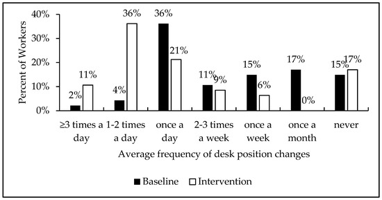 Figure 3 shows the differences among all workers in the frequency of desk position changes per work day. The largest sub-population of workers with the greatest improvement were those in the 1–2 desk position changes per work day. Out of 47 staff members, these group of 2 staff members (4%) increased to 17 staff members (36%) after the intervention. Another important finding was the elimination of the sub-group of staff members who used to change desk positions once a month (8 staff members to 0 staff members), indicating that the software reminders were successful at getting the lowest frequency users to change position.