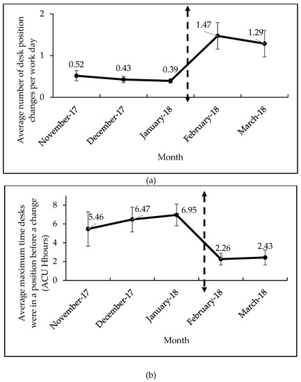 Figure 4 illustrates the monthly trends for two outcome measures (average number of desk position changes and maximum ACU time the desk was in a position) at each phase of the study: baseline (November 2017, December 2017, January 2018) and intervention (February & March 2018). For the average number of desk position changes (