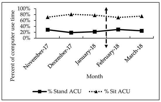 9]. Although the stand–sit ACU time change from the intervention was not statistically significant, the workers still had more desk transitions during the work day and broke up long periods of time in which the desk was in one position. The software reminders successfully changed and improved the sit-stand desk behavior for the staff members.