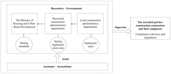 The main construction participants in the safety information system are three parties: governments, associations, and construction contractors. Governments are more authoritative, and their participation is more necessary than other participants. Therefore, we have defined the role of governments as recorders, aggregators and publishers. Associations assist governments to discipline the industry by improving the industry’s credit self-discipline standards and improving the industry’s integrity mechanism. As the recorded parties, construction contractors and their employees should comply with laws and regulations. Three participants interact and restrict with one another. Their relationship is shown in Figure 1.