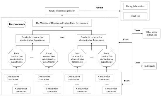 Complete, timely and reliable safety information is the foundation of the safety information system. The safety information collected by governments from construction contractors is uploaded to the safety information system and updated in real time. According to the information, the safety information system will automatically rate the contractors. Some contractors who have bad performance in safety issues will be put on the blacklist, which means that their business will be affected. The structure of the safety information system in the construction industry is shown in Figure 2.