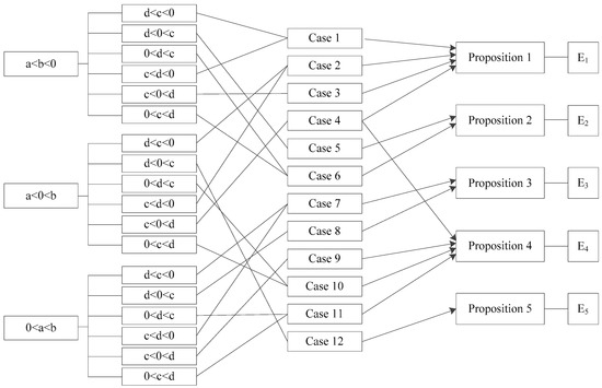From the discussion above, we could not determine the signs of these formulas easily. Therefore, we conducted a classification discussion based on the size relationship of a, b, c and d. The specific classification process is divided into the following three stages. On the first stage, under the premise that a is definitely smaller than b, we classify the size of these four symbols into 18 basic circumstances. We further derive the evolution path of each circumstance and its evolutionary stable equilibrium point. On the second stage, in order to simplify and clarify the discussion process, we combined some of these circumstances in line with the conditions when a stable equilibrium state is reached. Therefore, the 18 basic circumstances are classified into 12 cases. We could derive 12 formula combinations to conduct further analysis into this question, and then comes to the third stage. At this stage, we classify these 12 cases according to five possible equilibrium points: , , , , , and finally get five corresponding propositions. The specific classification process is shown in Figure 3.