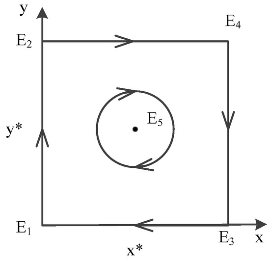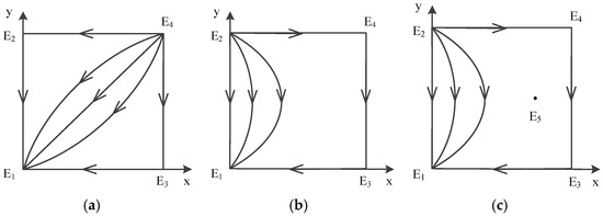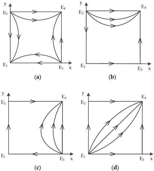 Same as the discussion above, when , the sign of is positive and the sign of, we could derive . Point does not exist, there are only four possible equilibrium points left: , , , .