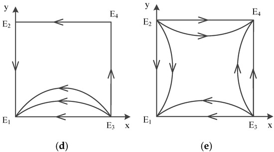 Diagram on dynamic evolution of equilibrium points in , (a) Case 1 (b) Case 2-1 (c) Case 2-2 (d) Case 3 (e) Case 4.