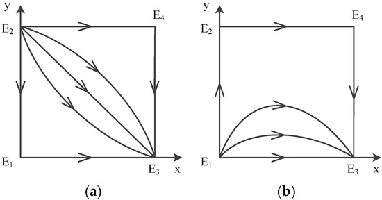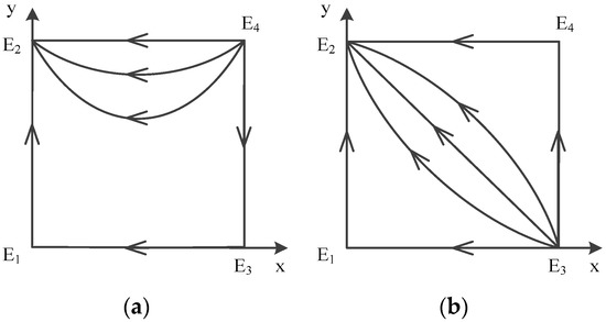 In a word, point does not exist, and there are only four possible equilibrium points left: , , , . The analysis of local stability of equilibrium about these four points is shown in Table 6 (Case 1). According to the conclusion, the trace of dynamic evolution is depicted in Figure 4a, which shows dynamic evolution diagram of strategies between government and contractors.