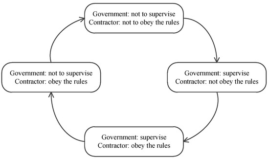 The contractor has two behavioral strategies: the first is to obey the rules; the other is not to, particularly not to follow the relevant contractual and policy regulations. This behavioral strategy will obtain certain additional benefits, but it will cause certain detriments to their social interests at the same time. Therefore, the behavioral strategies for contractor are {obey, not obey}. The government also has two strategies: one is to conscientiously supervise the behavior of contractors; the other is not to supervise. The supervision strategy can restrain the contractor’s irregularities to a certain extent, and reduce the contractor’s additional income, but it will also generate certain supervision costs. Therefore, the behavioral strategies for government are {supervise, not supervise}.