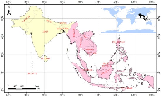 The study area includes the two regions of South Asia and Southeast Asia (Figure 1). A total of 7 countries, Bangladesh, Bhutan, India, Maldives, Nepal, Pakistan, and Sri Lanka make up South Asia. The climate of these places varies from tropical monsoon in the south, to temperate in the north, a range which is influenced by altitude, proximity to the ocean, and the characteristics of the monsoon season. There are 11 countries in the region defined as Southeast Asia, namely, Brunei, Cambodia, East Timor, Indonesia, Laos, Malaysia, Myanmar, Philippines, Singapore, Thailand, and Vietnam. The climate is hot all year and rainfall is generally caused by the seasonal monsoon. Exceptions to this are found in Northern Vietnam and the Himalayan region, where higher elevations produce a cooler, subtropical climate (https://en.wikipedia.org/wiki/Main_Page).