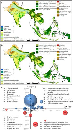 In this study, with the annual land cover and terrestrial ecoregions data, the final land cover categories were defined based on plant functional categories (Figure 2) []. Based on previously published studies that considered the parameter of ecosystem-atmosphere exchange of CO2 in different terrestrial ecoregions, we determined NEP values for the various land cover categories and corresponding annual CO2 flux as shown in Table 1 (±NEP). All the NEP data were from public literatures.