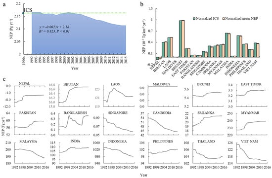 Values of NEP in the study area during 1992–2015. (a) Annual values of NEP in South and Southeast Asia; (b) annual values of NEP for all 18 countries; (c) initial level of carbon sequestration (ICS) and annual difference (AD) values of all 18 countries. The NEP of Maldives is zero due to its pocket land area.