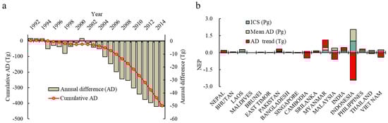 Over the study period, the quantum of cumulative carbon sequestration decreased by 414.95 Tg compared with the early 1990s. Among the 18 countries, the largest contributors to this change were Indonesia (503.5 Tg), Vietnam (139.3 Tg), Cambodia (118.8 Tg), and Malaysia (94.2 Tg). In fact, the amount of NEP in some countries, such as Myanmar, India, Nepal, and Laos increased over a year (Figure 4b). However, the total increased amount of NEP was too far to offset the substantial decreasing amount of NEP in several major countries. The result was also mutually confirmed with the point we obtained above.