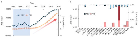 Actual radiative forcing (ARF) and potential radiative forcing (PRF) in South and Southeast Asia (a) and 18 countries (b).