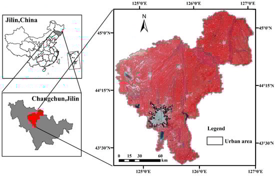 Location of the study area of the municipality Changchun (Landsat8 false-color images).