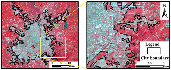 One important point that requires more explanation is the definition of urban and rural area. In Wu’s review article, high human population density and extensive impervious surface area are two most widely used factors to define urban areas [48]. According to the thermal differences between man-made land cover and natural surfaces, the city boundary was identified by visual interpretation mainly based on the percentage cover of impervious surfaces. The urban area is a continuous area without interruption in space. The urban area in this study is shown in Figure 2.