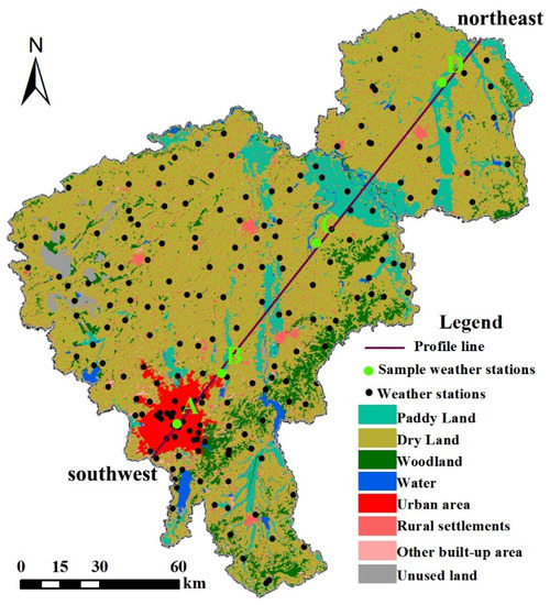 In this study, based on the principle that the profile should be across different land use types and pass through the whole study area, a southwest-northeast profile was produced according to the means of hourly interpreted air temperature maps. Four weather stations that were located nearest to the profile line were selected as sample points to better provide transection information. As a result, 24 profiles representing 24 h were used explore the spatiotemporal variations at the same time.