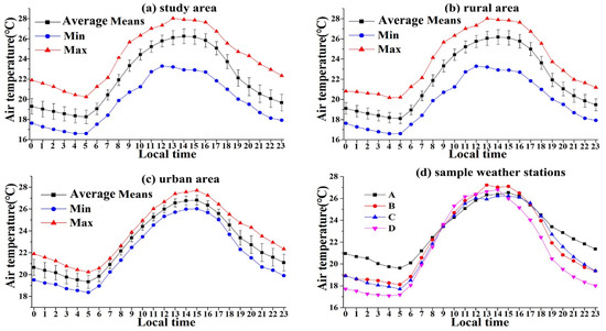 Hourly variations in the mean with standard deviation, maximum and minimum air temperature for the study area, rural area, and urban area, and the average air temperature for four representative weather stations are shown in Figure 4. For the overall trends of the air temperature, all the different areas and weather stations showed similar trends in that the air temperature decreased from 00:00 to around 05: 00, then increased until around 14:00, and then decreased again. The trend looked like a horizontal “S-shape”.