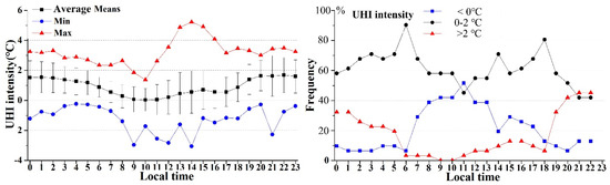 The values of UHI intensity ranged from −2.97 °C to 5.22 °C. The higher UHI intensity usually occurred during the nighttime. During the nighttime, more than 20% of the days showed an UHI intensity greater than 2 °C, and between 20:00 to 22:00, the proportion reached over 40%. An UHI intensity over ± 2 °C was rare during the daytime because the temperature of the urban area and rural area was very similar. This finding was expected, as studies conducted in Orlando [20]. The UHI intensity declined quickly after sunrise and reached its lowest value (nearly 0 °C) during 09:00 to 11:00. On average, most of the UHI intensity values were between 0 °C and 2 °C.