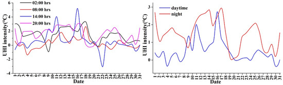 It seemed that the UHI intensity showed larger variations during the hottest period (13:00–15:00) (also seen in Figure 5). For the difference in UHI intensity between the daytime and nighttime (Figure 6), it could be seen that the daytime UHI intensity was rarely larger than that of the nighttime [55].