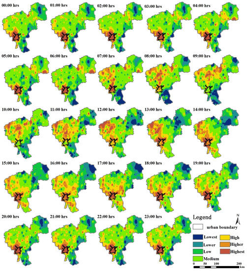 The air temperatures observed at 195 weather stations in Changchun made it possible to map the hourly variations of the thermal environment in a spatially explicit way by interpolation. As mentioned, in Section 2.3, hourly maps reclassified into seven air temperature regions with different colors were produced (Figure 7), thereby making it easier to distinguish hot regions.