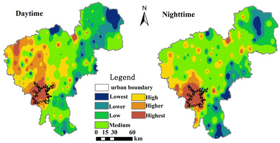 According to the values of the interpolated maps, the study area was reclassified into seven different regions: highest, higher, high, medium, low, lower, and lowest, to depict the thermal environment (Table 1) [24,51]. In this study, zones belonging to high, higher and highest were treated as H-region, which was warmer than other zones, and zones belonging to low, lower, and lowest were treated as the L-region.