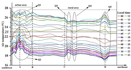 Air temperature profiles over 24 h in the direction from southwest to northeast (A, B, C and D are the sample weather stations, and their locations are shown in Figure 3).
