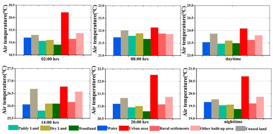 As shown in Table 6, the temperature of different land use types showed clear differences. The urban area had the highest temperature in the nighttime, daytime, and whole day, but had the smallest TDDN. The woodlands had the lowest temperature in the nighttime and whole day, while the mean temperature of the paddy land during the daytime was the lowest. The woodlands together with unused land had the largest TDDN. For hourly variations, the urban area had the largest values during most hours, except from 09:00 to 12:00, during which the unused land mainly located in the northwest part of the study area was the hottest. As a result, the UHI intensity was close to zero during this period. On the contrary, the woodlands had the lowest temperature, except for from 12:00 to sunset, which was when paddy land was the coolest. To show the temperature difference among the different land use types more clearly, Figure 10 shows the differences at four representative hours, daytime, and nighttime with the same temperature scale in the y axis. It can be seen that at 02:00, 20:00, and nighttime, the temperature of the urban area was much higher than that of the other land use types. Meanwhile, at 08:00 and in the daytime, the temperature differences between the urban area and rural land use types were not significant. At 14:00, the temperatures of unused land and other built-up area were much higher than those of the other rural ones, and were almost as high as that in the urban area.