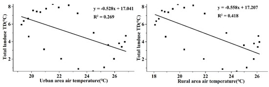 Figure 11 shows that the total land use TD presented negative correlations with both urban and rural temperatures. However, the influence of rural temperature on the total land use TD was stronger than that of the urban temperature. It seemed that with the increase in temperature, the temperature difference between land use types became smaller.