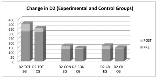 Change in attentional variables (D2 test) over time. PRE = Pretest; POST = Posttest, EG = Experimental group; CG = Control Group.
