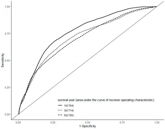 In a ROC curve analysis, the area under the curve was 0.764, 0.714, and 0.705 in the first, third, and fifth year, respectively (Figure 1).