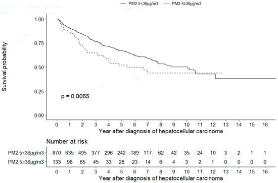 Although most patients (870/1003 or 86.7%) were exposed to ambient PM2.5 concentrations of <36 µg/m3, some patients (133/1003 or 13.3%) were exposed to ambient PM2.5 concentrations of ≥36 µg/m3 (Table 2). The patients with HCC were aged 61.1 ± 12.1 years, and most were male (73.0%). Hepatitis B virus and hepatitis C virus were observed in 56.3% and 38.6% of the patients, respectively. The majority of patients were diagnosed as having HCC at an early stage as follows: stage 0: 14.0%; stage A: 34.1%; stage B: 32.7%; stage C: 14.7%; and stage D: 4.6%. Furthermore, the liver cirrhosis scores were as follows: Child–Pugh 0: 28.6%; Child–Pugh A: 49.5%; Child–Pugh B: 16.8%; and Child–Pugh C: 5.1%. Patients were followed up for 3.32 ± 2.97 years. At the end of the analysis, 288 (28.7%) patients had died. Patients with HCC living in an environment with ambient PM2.5 concentrations of ≥36 µg/m3 had a higher mortality rate than patients living in an environment with ambient PM2.5 concentrations of <36 µg/m3 (36.8% versus 27.5%, p = 0.034).