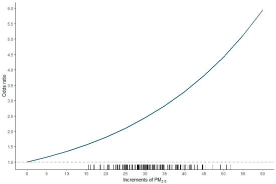 As illustrated in Figure 3, a nonlinear relationship was observed between the odds ratio and PM2.5. The odds ratio (95% CI) was 1.137 (1.015–1.264) for each increment of 5 µg/m3 in PM2.5 or 1.292 (1.030–1.598) for each increment of 10 µg/m3 in PM2.5.