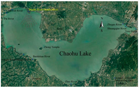 As can be seen in Figure 1, about 33 rivers, including 11 main rivers, exist around Chaohu Lake, and the Yuxi River that lies in the westernmost area is the only river that flows out of the lake. Nanfei River, which is located to the north, is the largest pollution source from the Heifei city, so black blooms are often observed in the estuary of this river in the summer [,].