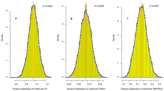 The posterior distribution of coefficients for Fe(II). The blue dotted line is the kernel density estimation for the coefficients, the solid red line is the posterior mean value of coefficients, σ2 is the posterior variance of coefficients, and yellow bars are the histogram of the density of posterior coefficients; (a) total phosphorus (TP) coefficient; (b) TN × dissolved oxygen (DO) coefficient; (c) oxidation reduction potential (ORP) × chlorophyll a (CHLA) coefficient.