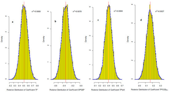 The posterior distribution of coefficients for S(-II). The blue dotted line is the kernel density estimation for the coefficients, the solid red line is the posterior mean value of coefficients, σ2 is the posterior variance of coefficients, and the yellow bars are histogram of density of posterior coefficients; (a) TP coefficient; (b) TP × water depth (DEP) coefficient; (c) TP × pH coefficient; (d) TP × O2 demand (CODMn) coefficient.