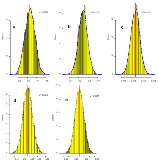 The posterior distribution of coefficients for SSC. Blue dotted line is the kernel density estimation for the coefficients, solid red line is the posterior mean value of coefficients, σ2 is the posterior variance of coefficients, and yellow bars are histogram of density of posterior coefficients; (a) Fe(II) coefficient; (b) S(-II) coefficient; (c) TP coefficient; (d) DEP coefficient; (e) Fe(II) × DEP coefficient.