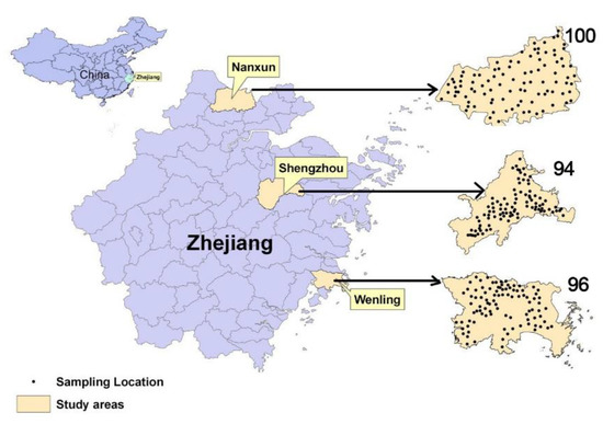 During the rice harvest season, a total of 100, 94, and 96 pairs of rice grain and soil samples were taken from Nanxun, Shengzhou, and Wenling, respectively (Figure 1), by means of a randomized design, on the basis of a land use map at 1:50,000 scale. Overall, one pair of soil-rice sample was taken per kilometer square based on the rice planting area. Each sample was the composite of at least five sub-samples within a distance of 10 m surrounding a specific sampling location. The rice and their rooted soil samples (0–15 cm) were collected from each site. The samples of soil and rice weighted at 1 and 0.5 kg, respectively. The longitudes and latitudes of the sampling points were recorded while using a portable global positioning system (GPS) receiver. In this study, the collected samples were mainly distributed in the plain paddy fields. The mountainous and downtown areas were avoided due to rare rice production distribution.
