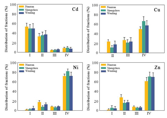 The percentage values of different fractions were used in order to compare the PTEs’ bio-availability of different production areas (Figure 2). For Cd in soils, the main component was the exchangeable fraction. The concentrations of fractions of Cd were in the order of exchangeable > Fe-Mn oxide bound > residual > organic bound. For Cu, Ni, and Zn in soils, the residual fraction was the main component, while the exchangeable fraction was low. Especially for Cu, its exchangeable fraction was lower than the detection limit. The concentrations of the fractions of Cu were in the order of residual > organic bound > Fe-Mn oxide bound, while soil Ni and Zn had similar fractions distribution with the order of residual > Fe-Mn oxide bound > organic bound > exchangeable.