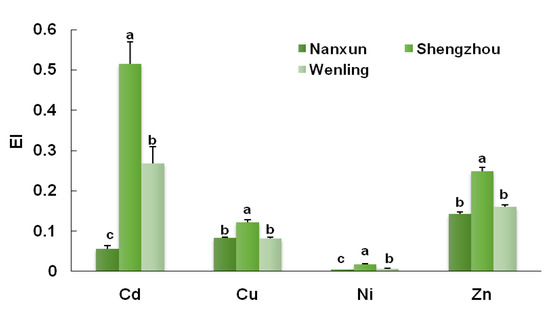 There were significant differences among the EIs of the PTEs in the three study areas. The EIs in Shengzhou were significantly higher than the corresponding values in Nanxun and Wenling (p < 0.05). The EIs of Cd and Ni of Wenling also were significantly higher than that of Nanxun, while no significant differences were found for Zn and Cu in these two study areas. Therefore, the PTEs transfer ability decreased, as Shengzhou > Wenling > Nanxun.