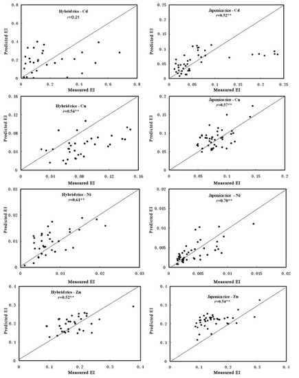 The data that were collected from Wenling were used to validate the prediction accuracy (Figure 4). Extremely significant correlations (p < 0.01) were found between measured value and predicted value of other PTEs for the Wenling study area, except for the Cd of Hybrid rice. For Cd, the correlation coefficient between the measured value and predicted value was only 0.21 (p > 0.05), which indicated that the accuracy of the transfer model was weak for EI of Cd of Hybrid rice. For Japonica rice, the correlation coefficient of Cd was 0.52 (p < 0.01). When the EI values of Cd were low, its predicted values tended to be higher than the measured values; when the EI values were high, its predicted values were lower than the measured values. A critical EI value of 0.2 for Hybrid rice and of 0.1 for Japonica rice was found. For the EIs of Cu, the correlations between measured and predicted values were extremely significant (p < 0.01). However, for the Hybrid rice, the predicted value of EIs of Cu was smaller than the measured values, the difference increased with the EI value increase. The transfer model of Zn had a similar prediction accuracy with Cu, even under the small EIs, both rices had higher predicted values than the measured values. Ni had the best prediction model with the highest correlation coefficients of 0.61 and 0.7 (p < 0.01).
