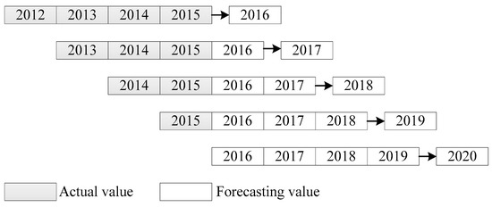 20]. To understand future trends in the coming years, the present study introduced the rolling mechanism into the modeling process in order to improve its medium-term forecasting performance. The rolling mechanism is a process by which data are metabolized. For instance, four given pieces of data,