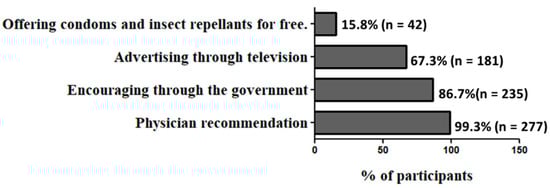 Physician advice was the primary factor that encourages participants to adhere to Zika prevention measures (Figure 2), followed by the government role and television. However, the majority of participants (99.3%, n = 276) reported that they had never been advised about Zika by a physician. The least important factor was the free offering of condoms and insect repellants.