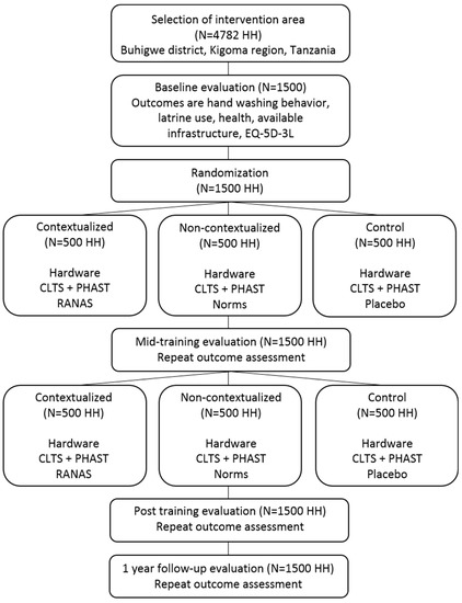 Participants will be randomized to one of three cohorts: A contextualized intervention cohort, a non-contextualized intervention cohort, or a control cohort. A contextualized intervention is defined as an intervention that is adapted to the local context by collecting data at baseline and using this data to fit the intervention to the specific population needs, as prescribed by the RANAS approach. In contrast, a non-contextualized intervention is a general WASH intervention that is not fine-tuned to meet the specific needs of the context at hand. For the purpose of this study, the target population will be subdivided into three cohorts: (1) a control cohort receiving a basic intervention + 1 placebo household visit, (2) a contextualized intervention cohort receiving a basic intervention + 9 household visits which are contextualized to the setting using the RANAS approach, and (3) a non-contextualized intervention cohort receiving a basic intervention + 9 household visits which are not contextualized, i.e., a general intervention. The study flow chart can be found in Figure 1.