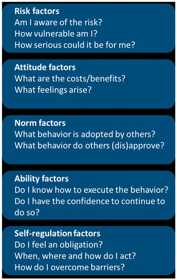 The contextualized intervention cohort will receive nine household visits of 20–40 min each, at a frequency of one visit every two months. The content of these add-on visits is based on the ‘Risks, Attitudes, Norms, Abilities, Self-regulation’ (RANAS) model (www.ranasmosler.com) [16]. The RANAS model consists of five behavioral factors, which are considered to be the drivers of WASH behavior [16] (see Figure 2). In a preparatory phase, RANAS dictates that questionnaires and interviews are used to better understand the context at play, i.e., do people in the intervention area wash their hands and why (not)? In a second phase, this data is used to develop the intervention, thus optimally tailoring the program to the needs in the community [16,34].