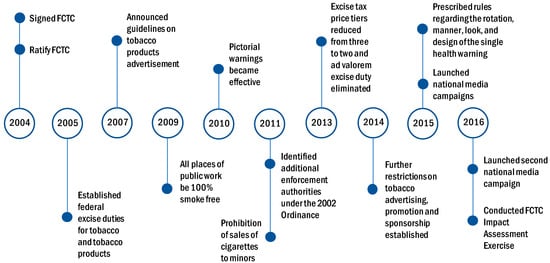 Timeline of major tobacco control measures in Pakistan. Source: Authors’ compilation from Nayab et al. (2018) [] and Pakistan Tobacco Control Cell website.